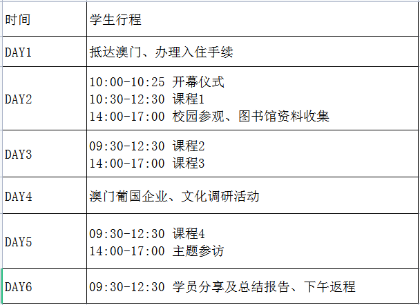 *上述行程、課程、參訪安排或會(huì)受不確定因素影響而作出調(diào)整(如場(chǎng)地臨時(shí)關(guān)閉、惡劣天氣等),澳門(mén)大學(xué)將保留最終決定權(quán)。
