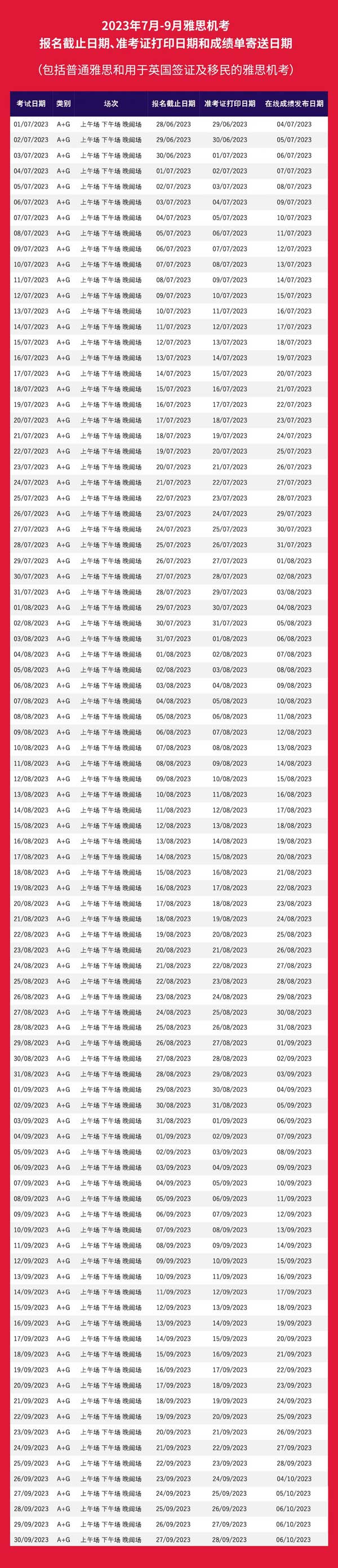 2023年7月-9月普通雅思和用于英國簽證及移民的雅思機(jī)考報(bào)名截止日期、準(zhǔn)考證打印日期和成績單寄送日期: