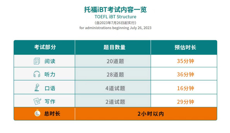 自2023年7月26日起, 托福iBT考試的時(shí)長將由三小時(shí)縮短至兩小時(shí)以內(nèi)。具體調(diào)整如下: